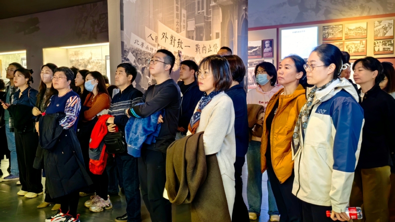 展厅内,党员教师循着“奋起救亡—津门浩劫—市区抗战—盘山烽火—赢得胜利—抗战英烈”的历史脉络,在一幅幅泛黄的历史图片前驻足凝视,在一段段珍贵的影像资料前凝神聆听,在一件件承载着烽火记忆的文物前深切感悟。从天津人民自发组织的抗日救亡运动,到共产党领导下的盘山抗日根据地斗争;从市区军民与日寇的殊死搏斗,到抗战胜利时的万众欢腾,党员教师们沉浸式回顾了党领导天津人民浴血奋战的壮阔历程,深刻体悟到津沽儿女在民族危亡之际展现的不屈风骨与家国担当。